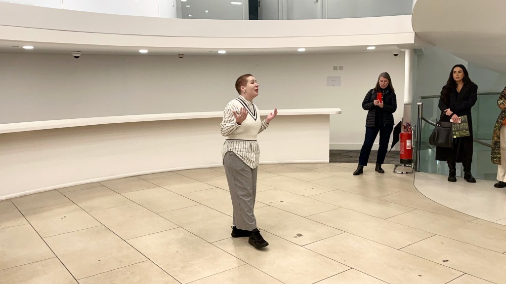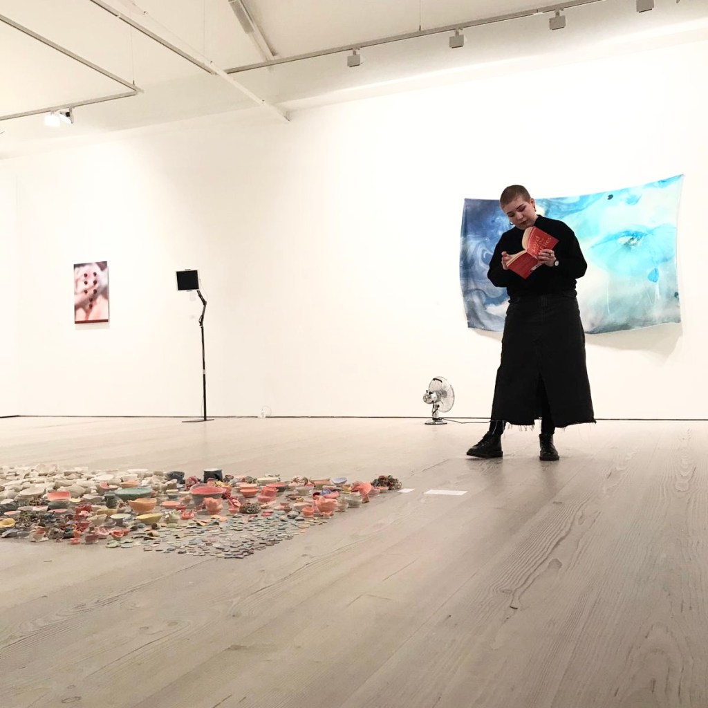 The Urge to Satisfy Literature perfomed at London Art Grads Now 2021, Saatchi Gallery.